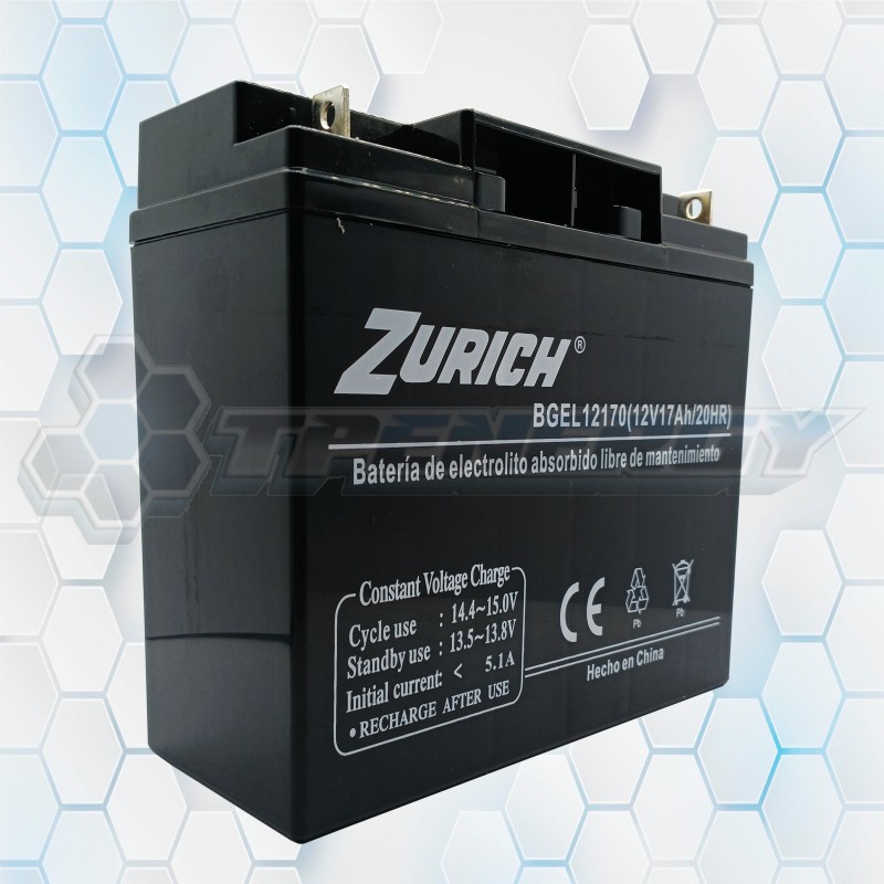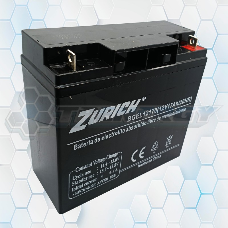 La batería de gel Zurich BGEL012170 está diseñada para ofrecer alto rendimiento y confiabilidad en aplicaciones como UPS, sistemas de respaldo, alarmas y equipos electrónicos. Fabricada con tecnología AGM sellada, es segura contra derrames y libre de mantenimiento, garantizando una larga vida útil.