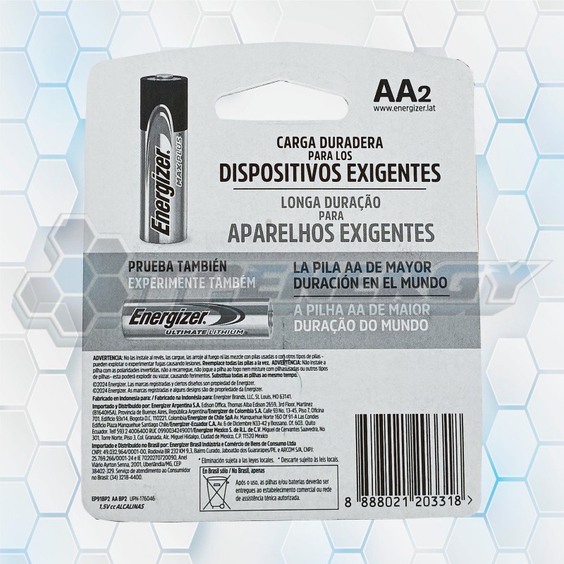 Las Pilas Alcalinas Energizer Max Plus AA E91 BP2 son la opción más duradera dentro de la línea alcalina de Energizer. Diseñadas para dispositivos de alto consumo, ofrecen carga prolongada y confiable, ideales para cámaras, juguetes, controles remotos y equipos electrónicos exigentes. Con tecnología avanzada, garantizan hasta 12 años de vida útil en almacenamiento.