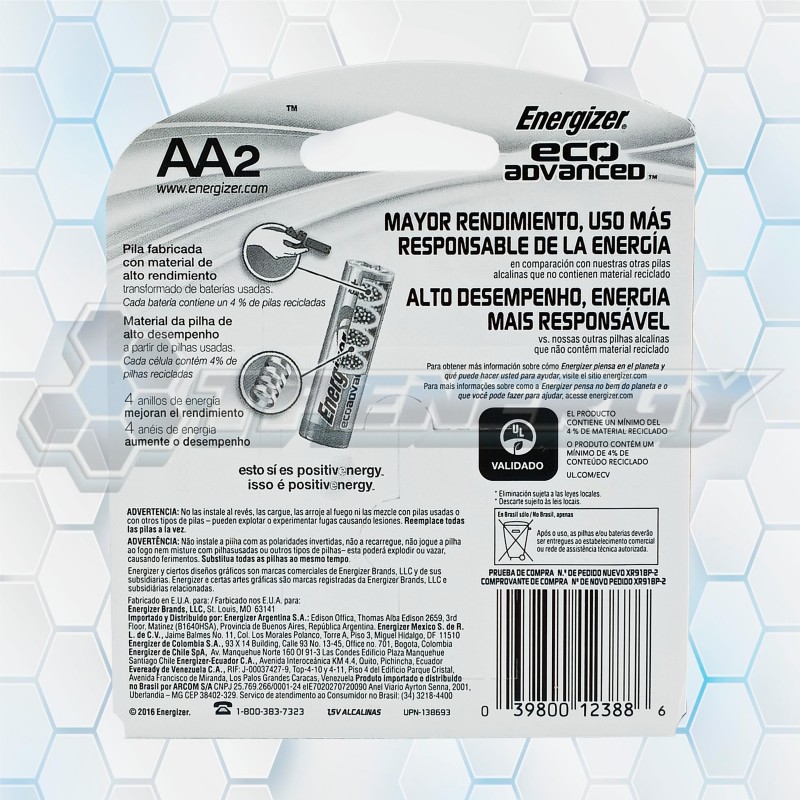 Las Pilas Alcalinas Energizer Eco Advanced AA XR91 BL2 son la primera opción en el mundo fabricada con pilas recicladas, ofreciendo alto rendimiento y responsabilidad ambiental. Diseñadas para dispositivos exigentes, brindan hasta un 60% más de duración en comparación con modelos estándar y mantienen la carga hasta por 12 años en almacenamiento.