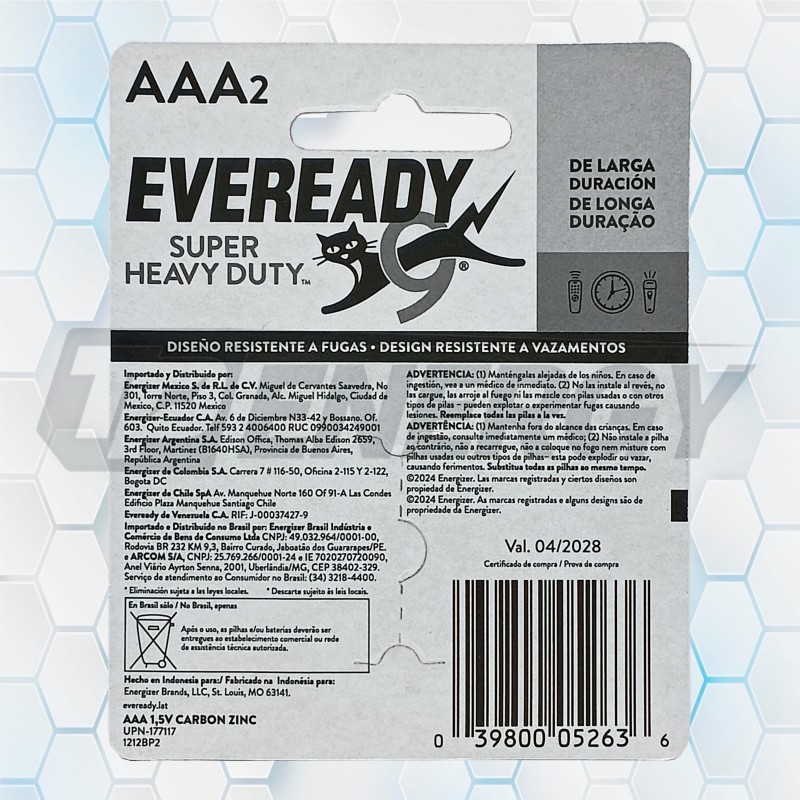 El bulto de Pilas Eveready AAA 1212BP2 presenta una opción económica, confiable y de alta rotación para distribuidores y comercios que buscan un producto estable y con demanda asegurada. Cada caja trae 18 blísteres sellados de 2 unidades, lo que facilita el control de inventario y la venta fraccionada. Estas pilas Super Heavy Duty están compuestas por tecnología Carbon-Zinc (Zn/MnO₂), diseñada para dispositivos de bajo consumo como controles remotos, linternas simples, relojes y pequeños electrónicos.