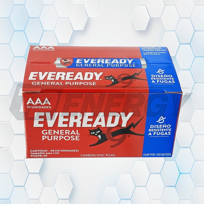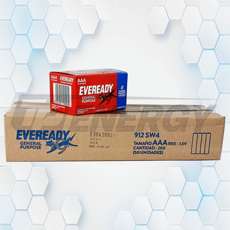 Las Eveready AAA 1.5V Carbón‑Zinc 912SW4 en bulto mayorista contiene 50 blisters x4 unidades (5 cajas internas de 10 blisters), ideal para distribuidores que requieren alta rotación y presentaciones listas para exhibir. Diseño general purpose con sello de calidad y resistencia a fugas.