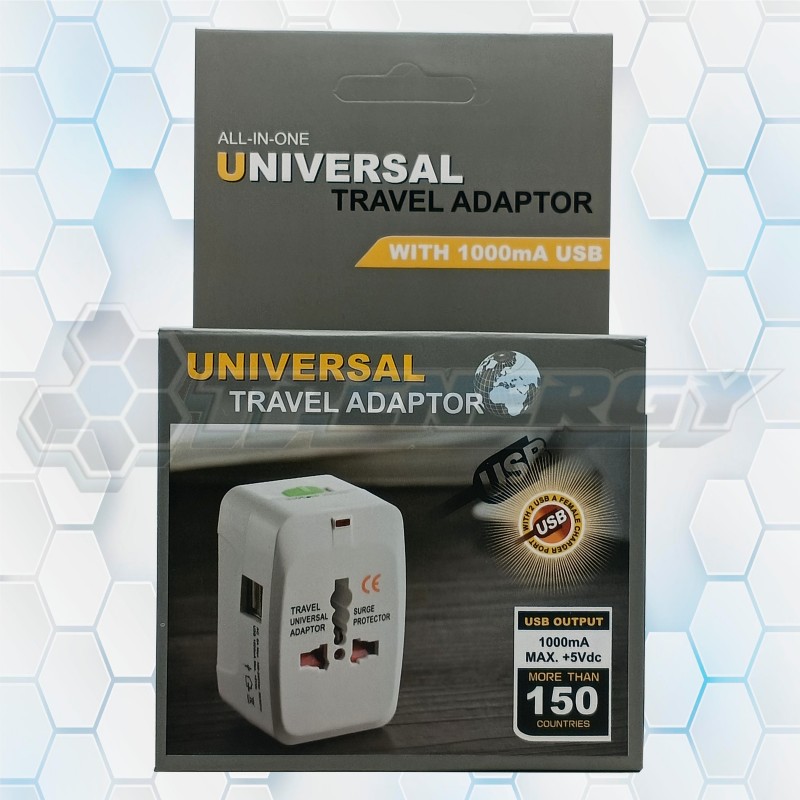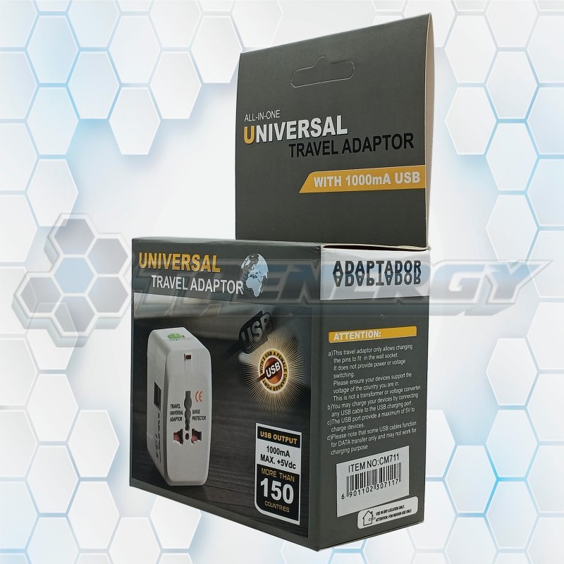 Adaptador universal de viaje modelo CM711 con entrada USB integrada. Compatible con más de 150 países, ideal para cargar dispositivos electrónicos de forma segura durante viajes internacionales.