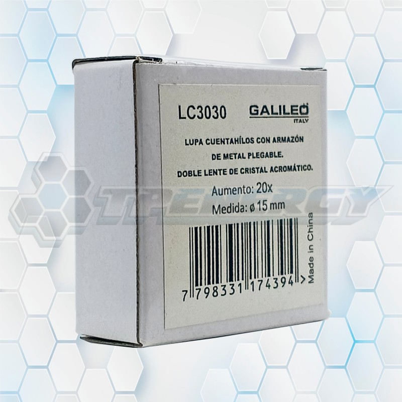 Lupa cuentahilos Galileo LC3030 con doble lente acromático de 20× y diámetro de 15 mm, armazón metálico plegable y estuche incluido. Ideal para tareas de precisión en textil, joyería, impresión y ciencia.