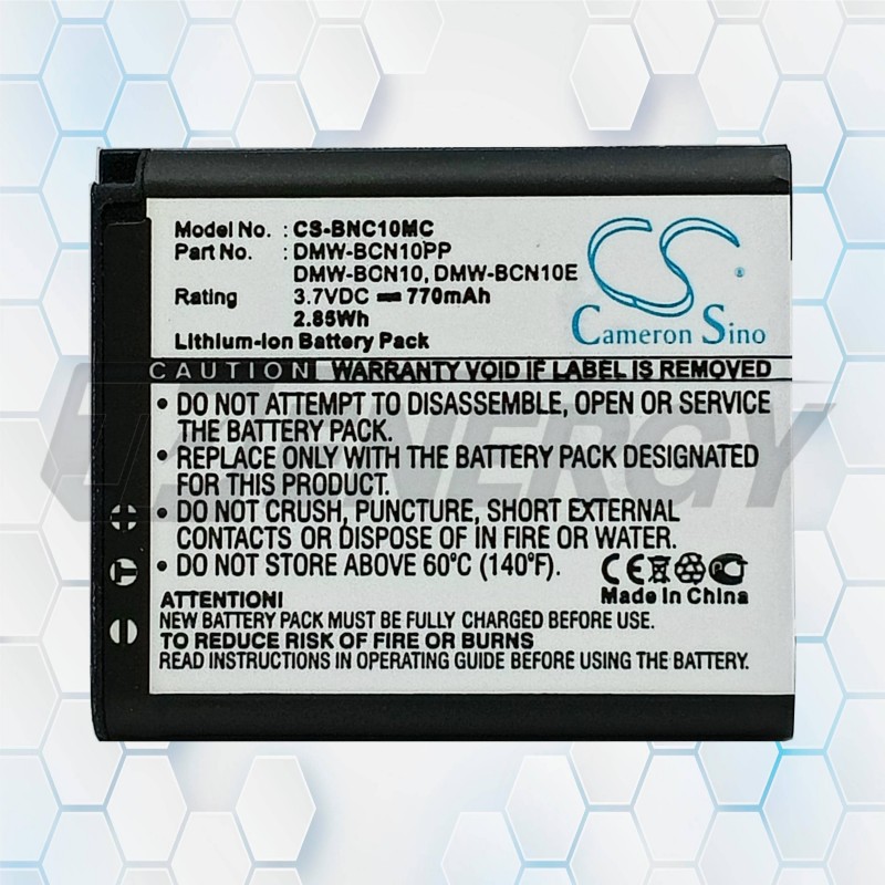 Part Numbers compatibles: DMW‑BCN10, DMW‑BCN10E, DMW‑BCN10GK, DMW‑BCN10PP, BP‑DC14, BP‑DC14‑E, BP‑DC14‑U