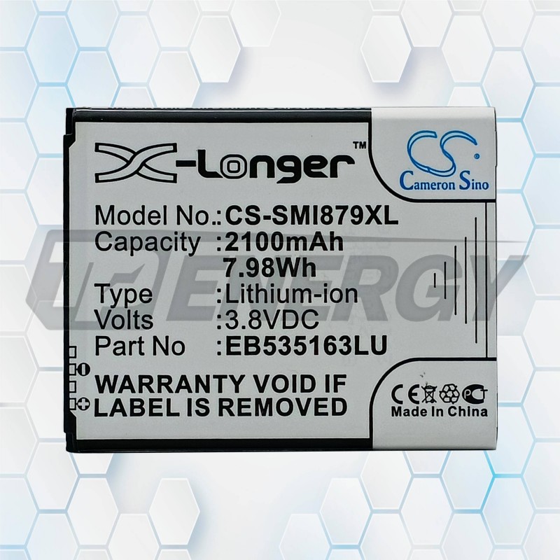 Modelo: CS‑SMI879XL Código compatible: EB535163LU Capacidad: 2100 mAh Energía: 7.98 Wh Voltaje: 3.8 V Tecnología: Ion de Litio (Li‑ion) Compatibilidad: