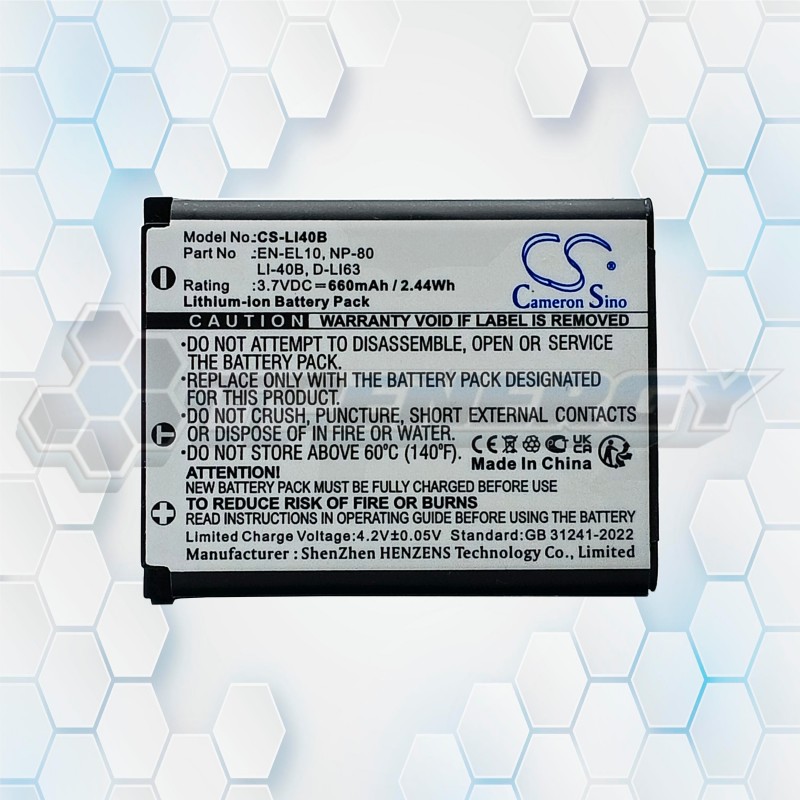 La batería Cameron Sino CS-LI40B es una opción confiable y económica para reemplazar modelos originales como Olympus LI-40B y LI-42B. Diseñada con tecnología de ion de litio, ofrece una capacidad de 660mAh y un voltaje de 3.7V, ideal para cámaras digitales compactas. Su tamaño compacto y peso liviano la hacen perfecta para llevar en cualquier equipo fotográfico.