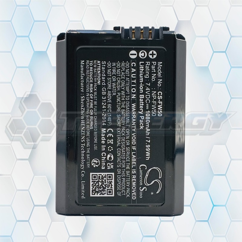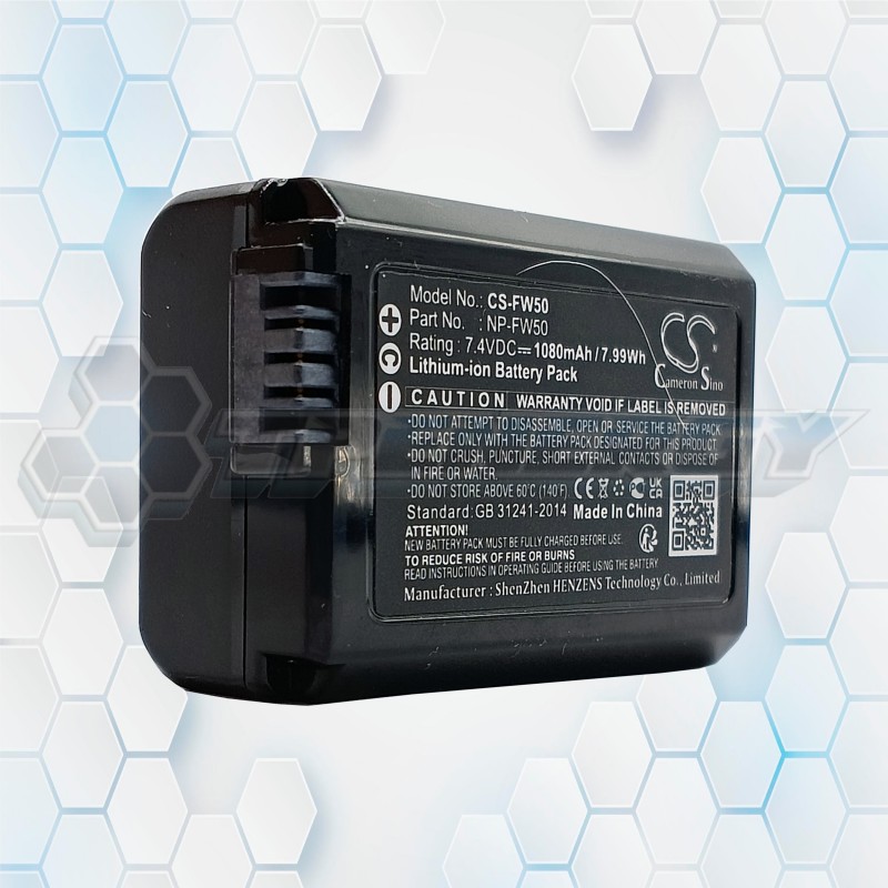 La batería Cameron Sino CS-FW50 es una solución energética de alta calidad para cámaras Sony de la línea Alpha y NEX. Diseñada con tecnología de ion de litio, ofrece una capacidad de 1080 mAh y un voltaje de 7.4V, lo que garantiza un rendimiento estable y prolongado en sesiones fotográficas o de video.