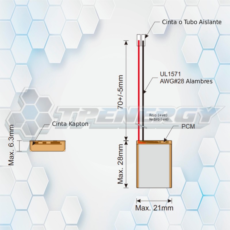 Su diseño plano y delgado permite una fácil integración en productos electrónicos modernos. Incluye cables de conexión de 70 mm y protección interna (PCM), lo que garantiza seguridad contra sobrecarga, sobredescarga y cortocircuito.