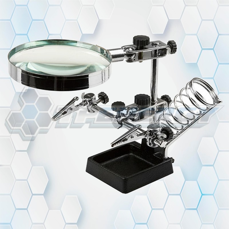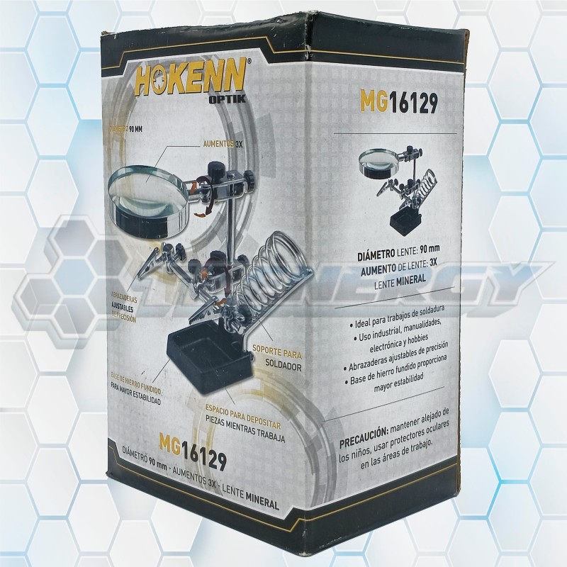 La Lupa con Doble Pinza y Porta Soldador Hokenn MG16129 es una herramienta profesional diseñada para trabajos de precisión en electrónica, soldadura y manualidades. Incorpora una lente mineral de 90 mm con aumento 3×, que ofrece una visión clara y detallada. Su estructura incluye abrazaderas ajustables de precisión, soporte para soldador y espacio para depositar piezas mientras se trabaja. La base de hierro fundido proporciona gran estabilidad, evitando movimientos durante tareas delicadas.