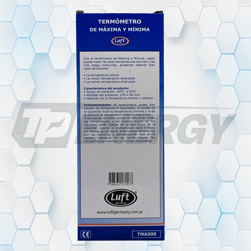 El termómetro de máxima y mínima Luft TMA900 está diseñado para registrar la temperatura actual, la máxima alcanzada y la mínima registrada, permitiendo un seguimiento preciso de las variaciones térmicas a lo largo del tiempo. Es una herramienta útil tanto para el hogar como para aplicaciones más técnicas.