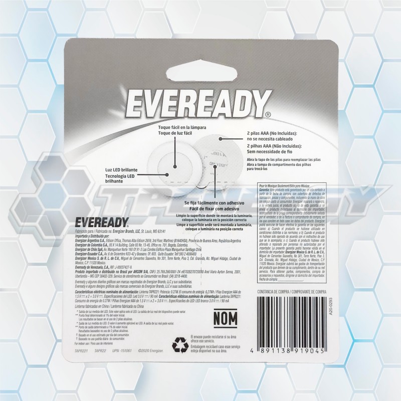 La Eveready TAPR22 es una linterna LED de toque diseñada para brindar iluminación rápida y práctica en espacios pequeños. Su formato compacto y autoadhesivo permite instalarla fácilmente en placards, bajo mesadas, mesas de luz o cualquier rincón oscuro del hogar.